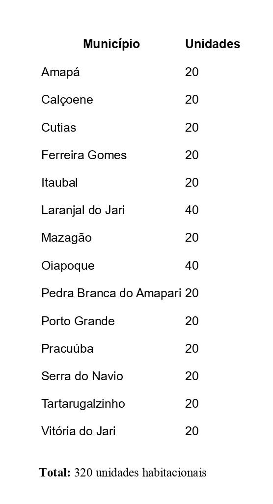 Para o estado do Amapá, um total de 14 municípios foram contemplados, com previsão de 320 novas unidades habitacionais. Vale destacar que Macapá e Santana não foram incluídas nessa seleção, já que sua população supera o limite estabelecido de 50 mil habitantes.