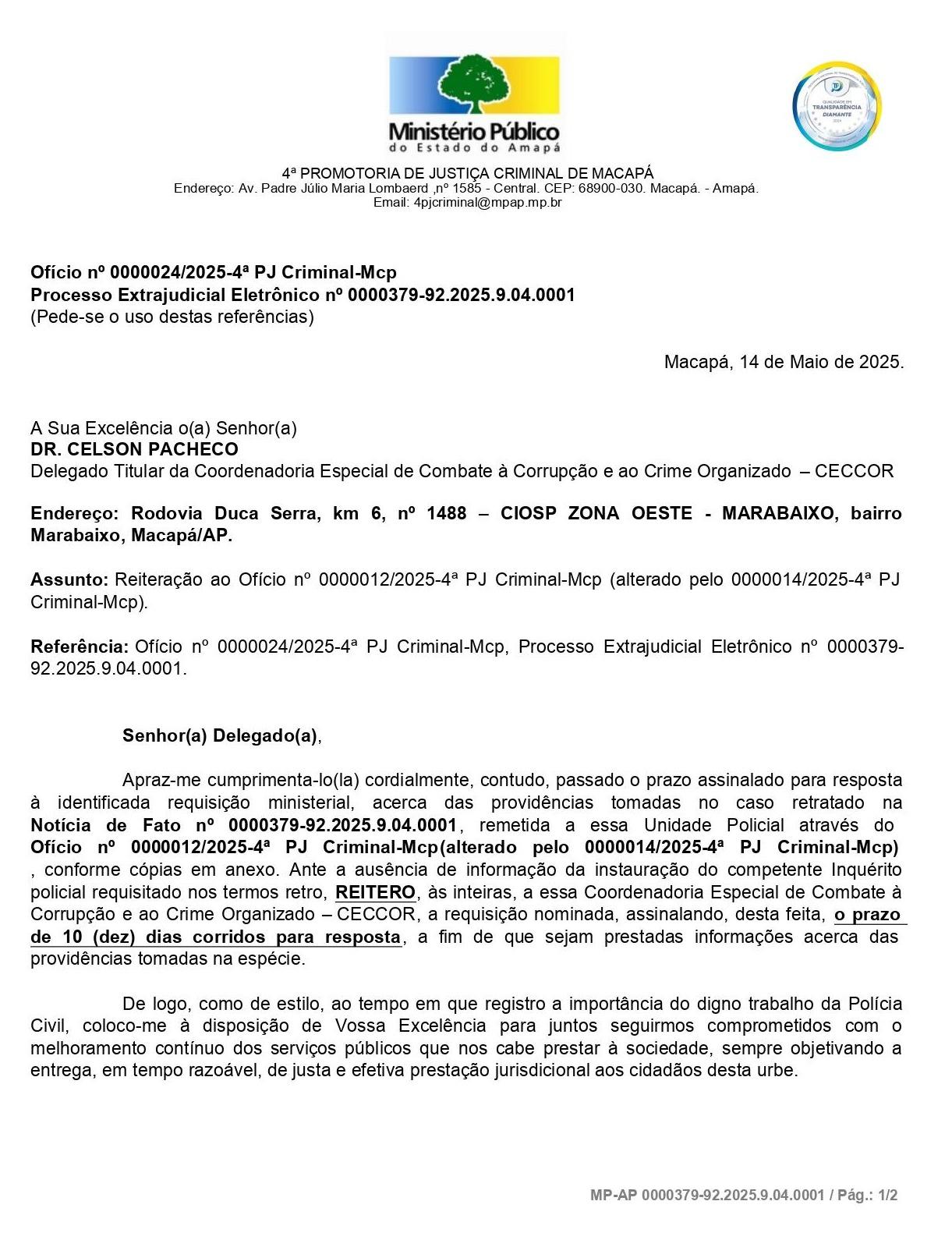 A reiteração da promotora Clarisse Lindanor Alcântara Lax ocorre após o prazo estabelecido para a resposta da Polícia Civil ter expirado, sem que a CECCOR tenha informado sobre a instauração do inquérito policial requisitado. O pedido do MP-AP, formalizado inicialmente no Ofício nº 0000012/2025-4ª PJ Criminal-Mcp (alterado pelo 0000014/2025-4ª PJ Criminal-Mcp), busca apurar as condutas do prefeito Antônio Furlan e de ex-gestores da CTMac: :Patrícia Almeida Barbosa (ex-diretora-presidente), Kleber Picanço Leal (ex-diretor de transportes) e Wanderberg Almeida Gomes (ex-presidente da Comissão Permanente de Licitação – CPL