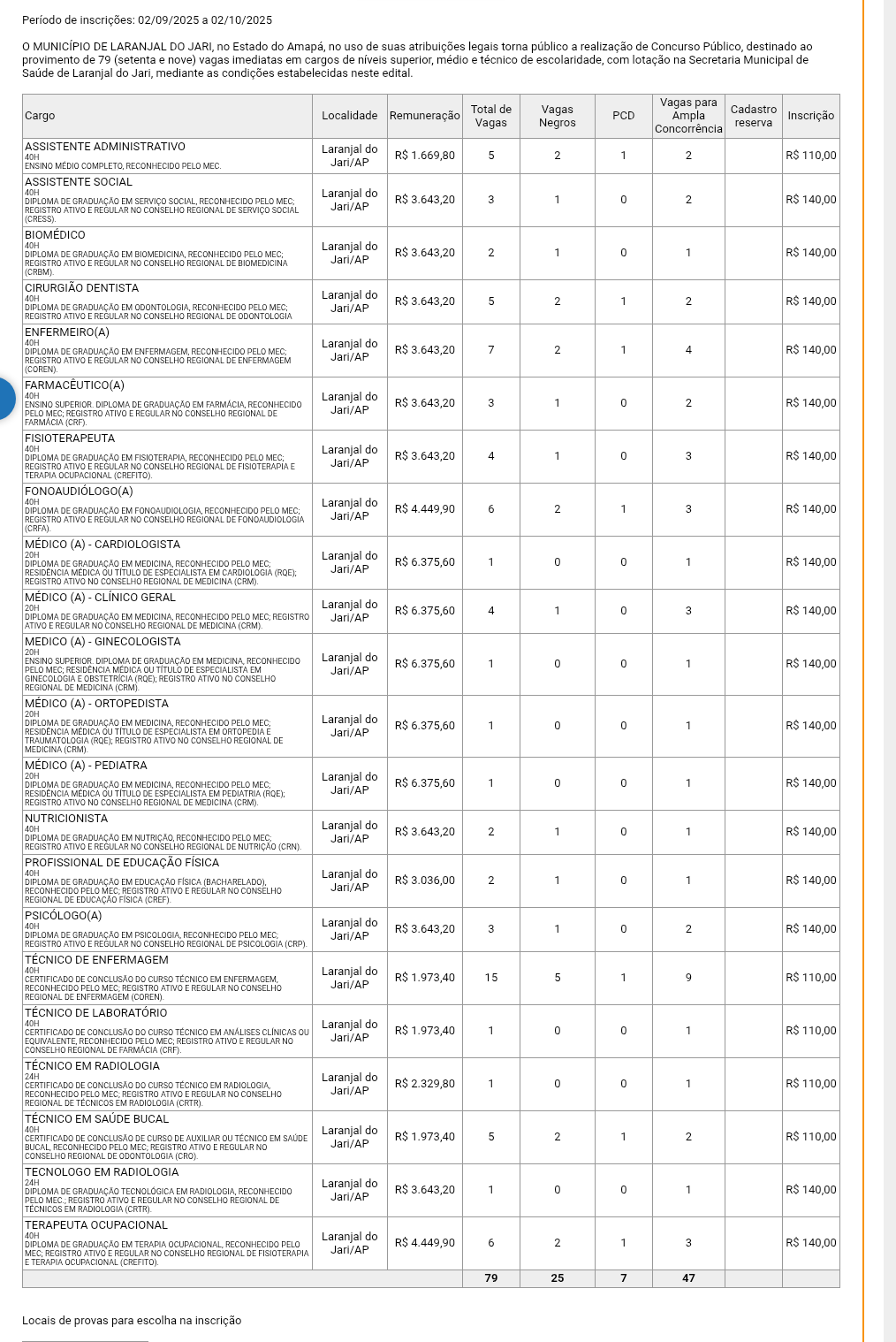 As inscrições começam às 14h desta terça-feira (2) e seguem até o dia 2 de outubro de 2025, exclusivamente pela internet. O edital prevê 79 vagas imediatas, distribuídas entre cargos de nível médio e superior. As provas objetivas estão marcadas para o dia 7 de dezembro.