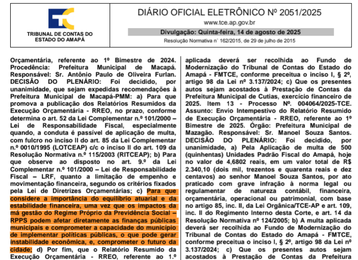 Em agosto, o Tribunal de Contas do Estado (TCE-AP) já havia emitido alerta semelhante, apontando riscos à saúde financeira do Regime Próprio de Previdência Social (RPPS) do município.
