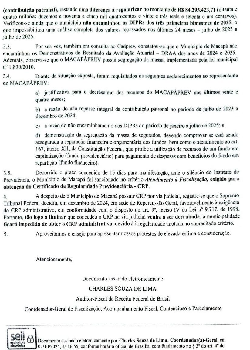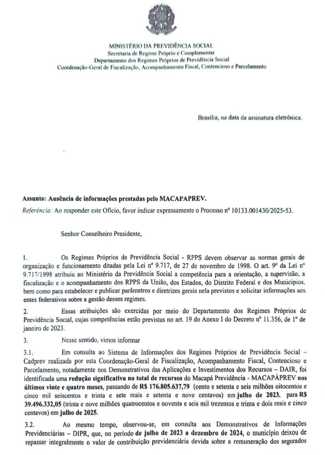 O documento, enviado ao Instituto de Previdência do Município de Macapá (MacapáPrev), cobra explicações sobre o destino do dinheiro, o não repasse integral da contribuição patronal e a falta de envio de relatórios obrigatórios entre 2023 e 2025.