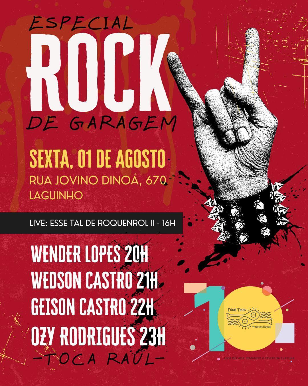 Mais tarde, a partir das 20h, a celebração segue na garagem da Casa de Produção da Duas Telas, com apresentações ao vivo de nomes conhecidos da cena rock do estado: Wender Lopes, Wedson Castro, Geison Castro e Ozy Rodrigues. O evento reforça o compromisso da produtora com o fortalecimento da música autoral e da cultura local.
