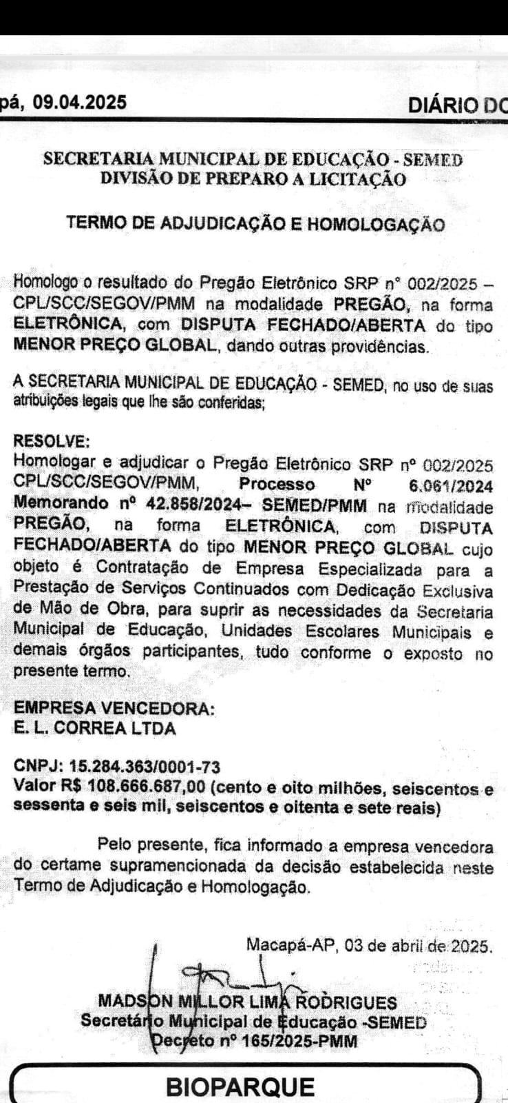 A Prefeitura de Macapá formalizou um novo contrato de R$ 108,6 milhões com a empresa E.L. Corrêa Ltda para a prestação de serviços em três secretarias, incluindo a crucial área da educação municipal e rural.
