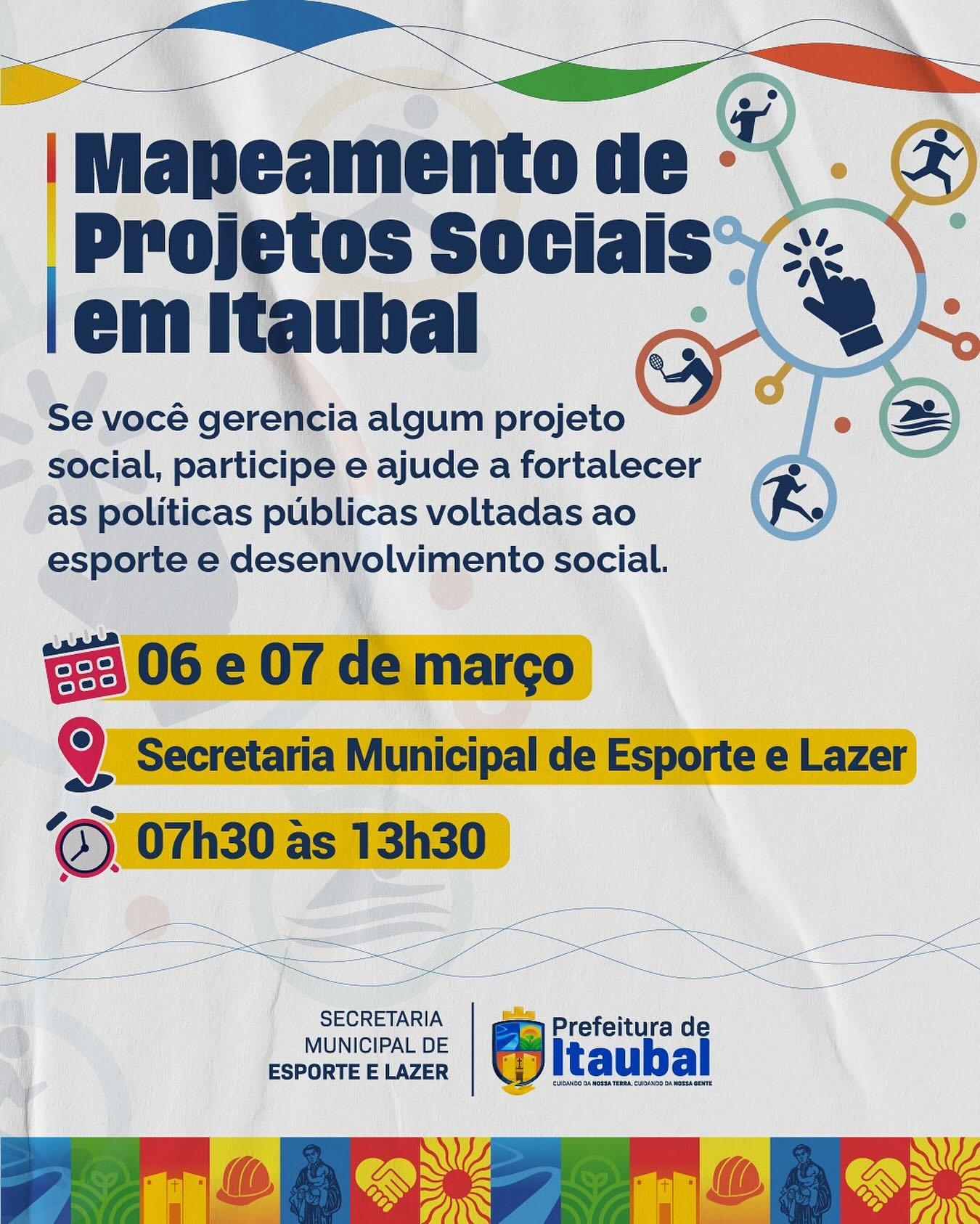 A Secretaria Municipal de Esporte e Lazer da Prefeitura de Itaubal, em parceria com a Secretaria de Estado do Desporto e Lazer (Sedel), realizará nos dias 6 e 7 de março um mapeamento dos projetos sociais existentes no município. O objetivo é fortalecer as políticas públicas voltadas ao esporte e desenvolvimento social, identificando as iniciativas em andamento e suas necessidades.