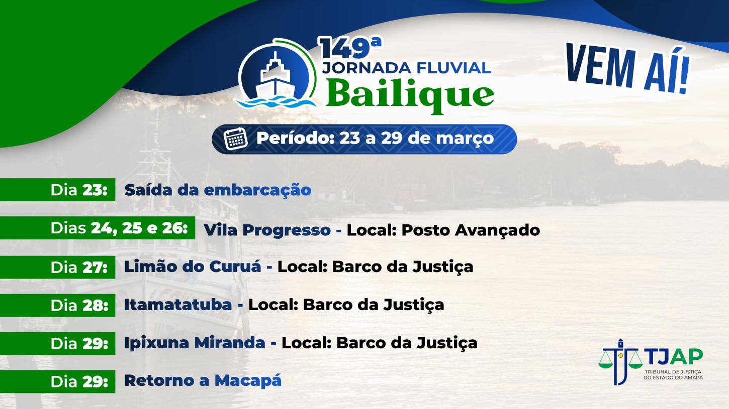 A equipe do Programa Justiça Itinerante do Tribunal de Justiça do Amapá (TJAP) está pronta para realizar a 149ª Jornada Fluvial 2025, que levará serviços essenciais às comunidades do Arquipélago do Bailique, de 24 a 29 de março. Sob a coordenação geral da juíza Laura Costeira e condução local do juiz Luciano Assis, a ação percorrerá Vila Progresso, Limão do Curuá, Itamatatuba e Ipixuna Miranda.