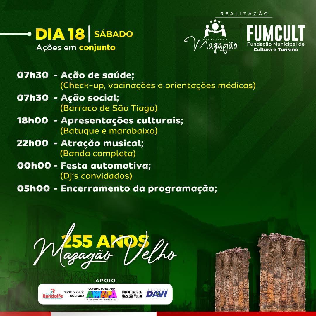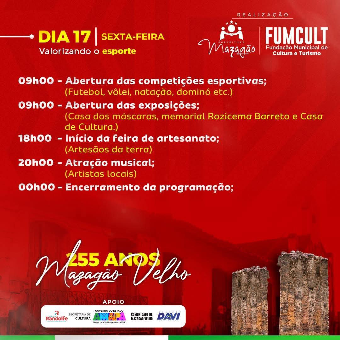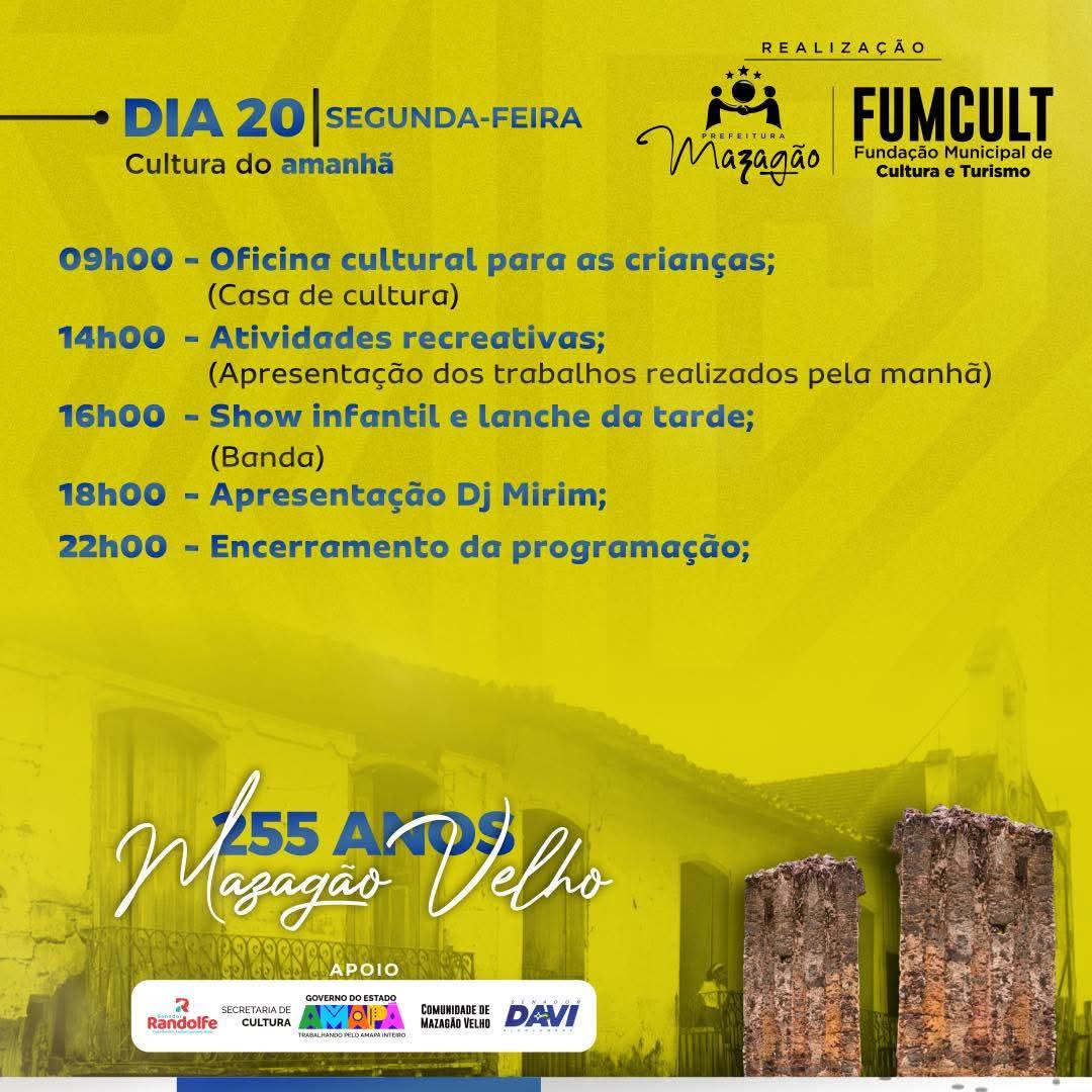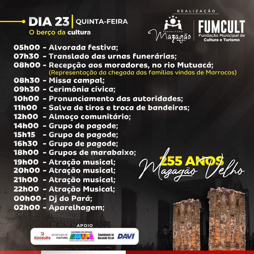 A programação do aniversário de Mazagão Velho será marcada por uma série de atividades que valorizam a cultura, a história e a tradição da cidade. Entre as atrações confirmadas estão:
