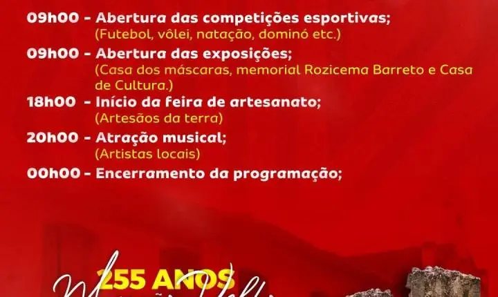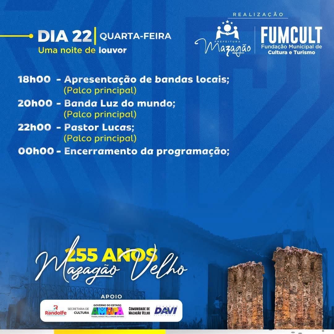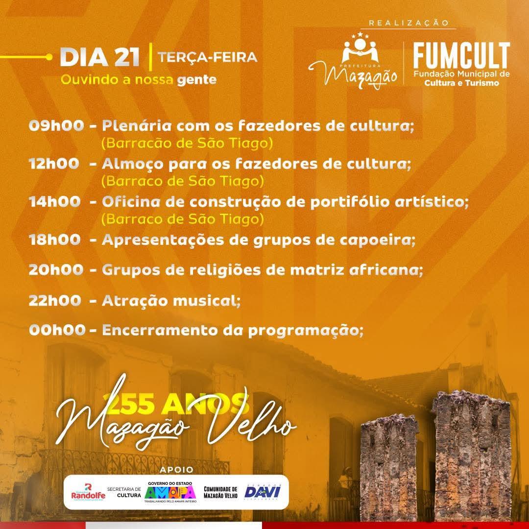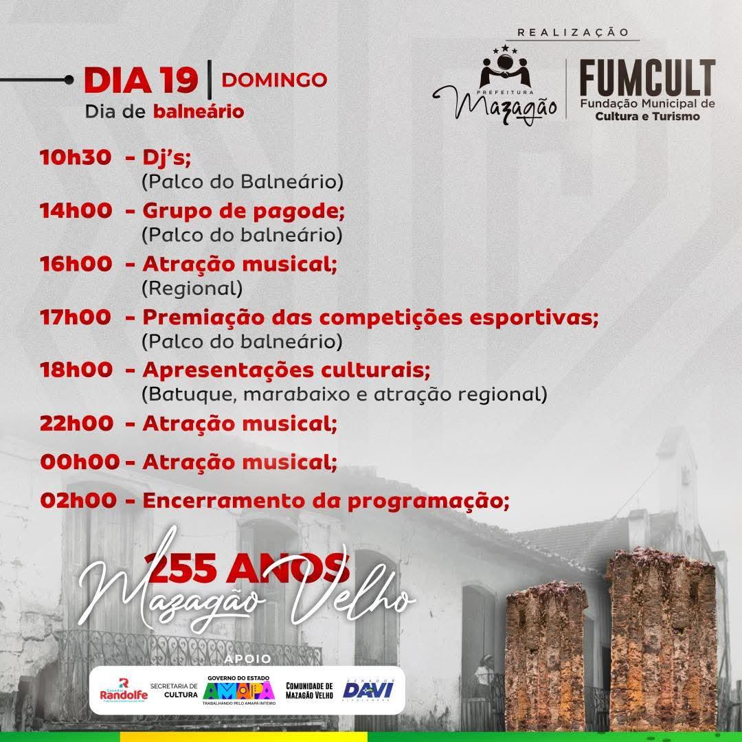 A programação do aniversário de Mazagão Velho será marcada por uma série de atividades que valorizam a cultura, a história e a tradição da cidade. Entre as atrações confirmadas estão: