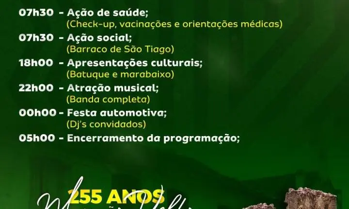 Eventos esportivos, ações de saúde, plenárias e oficinas, noite de louvor, apresentações culturais, atividades recreativas, almoço com os moradores mais antigos, festa automotiva e homenagens.