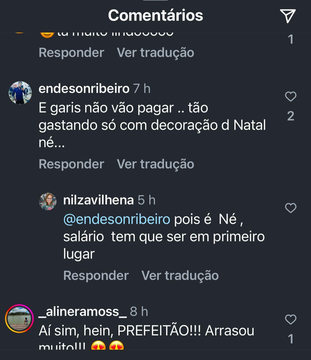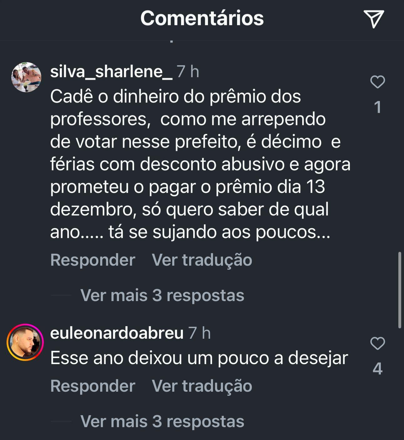 A falta de pagamento dos professores também gerou revolta. A usuária @silva_sharlene criticou os descontos abusivos em décimo terceiro salário e férias, além de questionar o pagamento do prêmio prometido para o dia 13 de dezembro. "Cadê o dinheiro do prêmio dos professores, como me arrependo de ter votado nesse prefeito", escreveu.