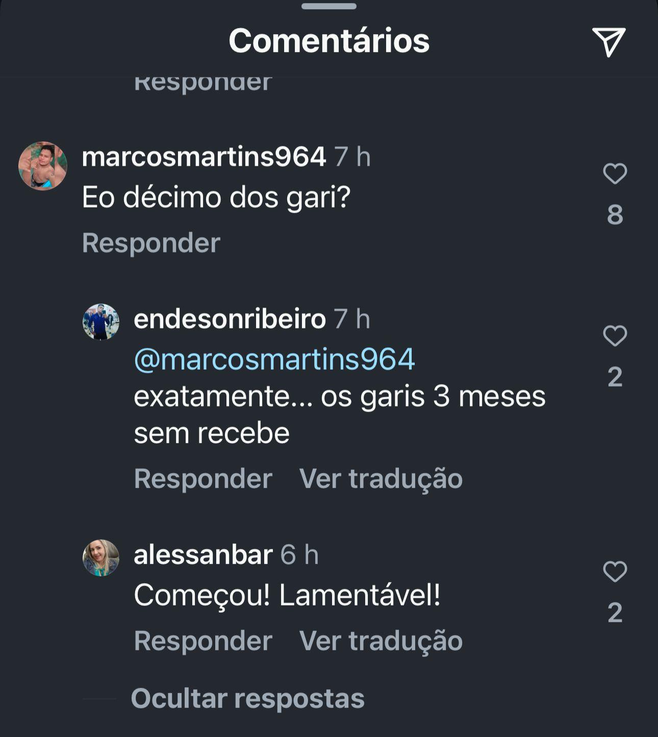 "E os garis, vão pagar quando?", questionou o usuário @endesonribeiro. "Salário tem que ser em primeiro lugar", afirmou @nilzavilhena.