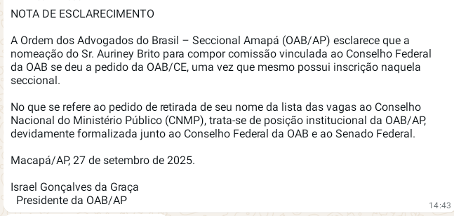 A Ordem dos Advogados do Brasil - Seccional Amapá (OAB/AP) publicou nesta sexta-feira (27) uma nota de esclarecimento que, em vez de dissipar dúvidas, acabou confirmando o que já se comentava nos bastidores: a entidade se mobilizou contra o ex-presidente Auriney Brito.