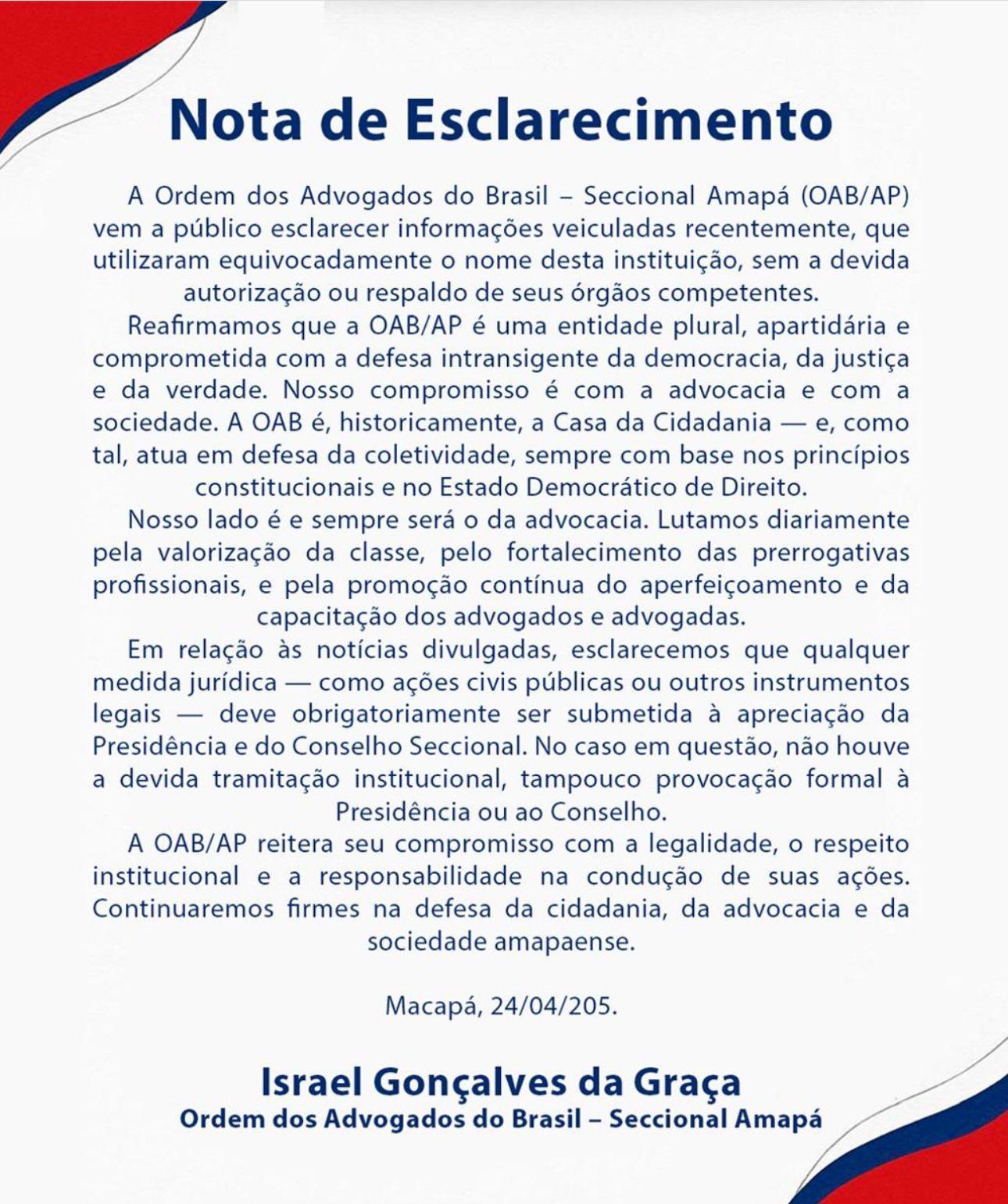 O presidente da Comissão de Concursos da OAB/AP, Diego Morpheu, expressou ao Portal Seles Nafes a preocupação da entidade com a moralidade e legalidade da contratação, que atropela a expectativa de tantos concurseiros. Mas, ao que tudo indica ele não tinha autorização para falar em nome da Ordem.