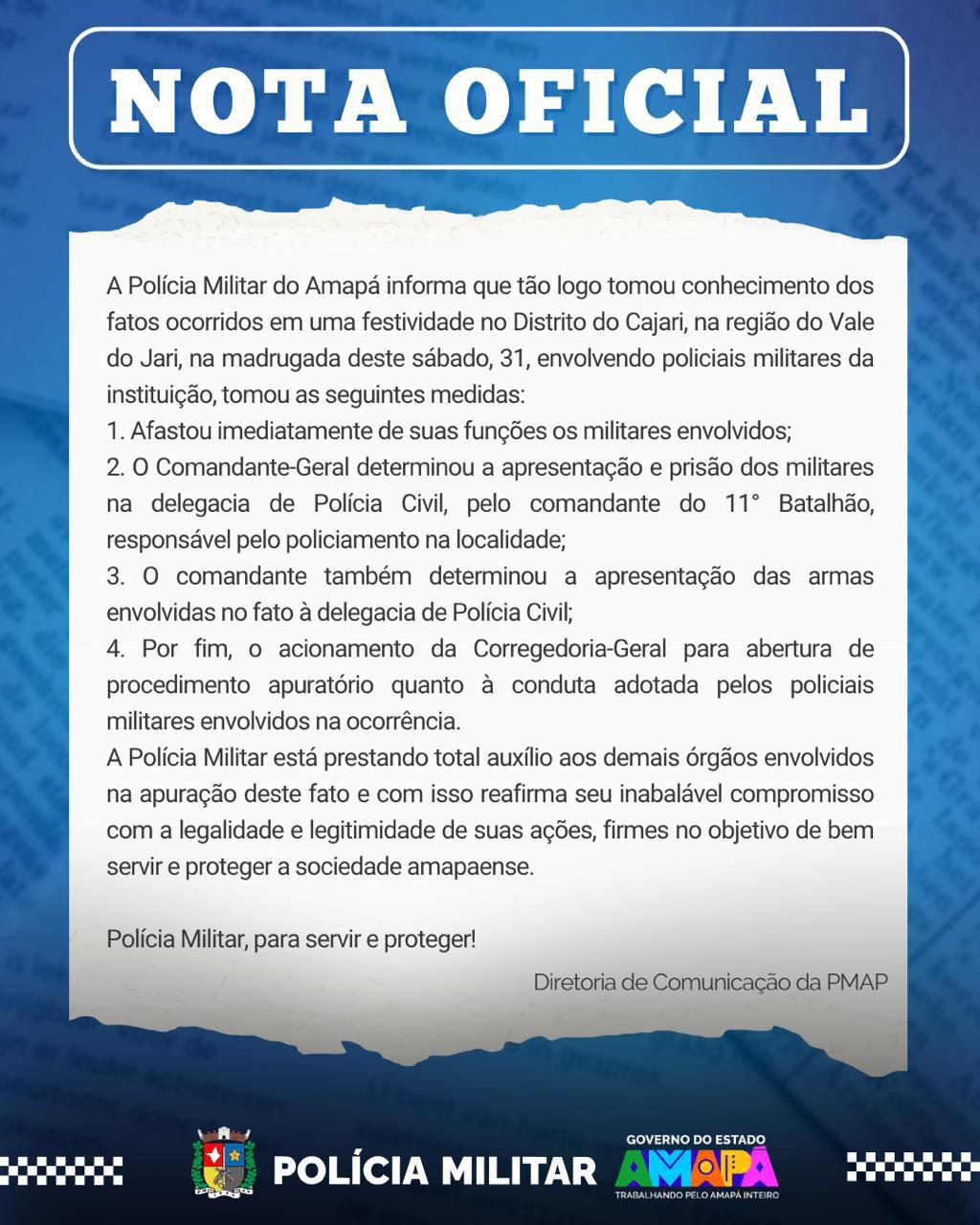 A Polícia Militar reiterou seu compromisso em prestar total auxílio aos demais órgãos envolvidos na apuração e reafirmou seu "inabalável compromisso com a legalidade e legitimidade de suas ações, firmes no objetivo de bem servir e proteger a sociedade amapaense".
