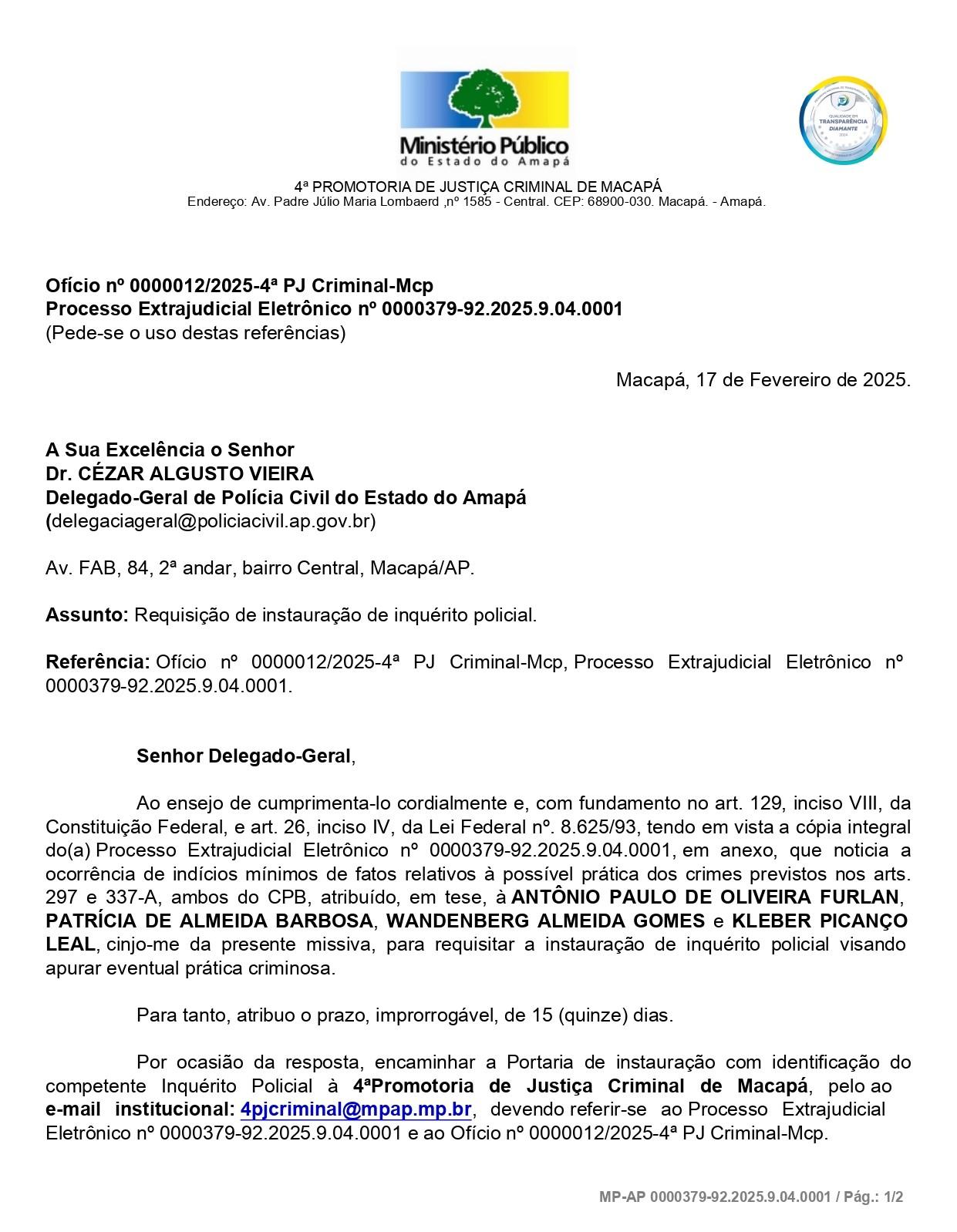 A promotora de Justiça Clarisse Lindanor Alcântara Lax requisitou ao delegado geral de Polícia Civil, Cezar Augusto Vieira, a instauração de inquérito policial para apurar as condutas do prefeito de Macapá, Antônio Furlan, e de ex-gestores da Companhia de Trânsito e Transporte de Macapá (CTMac). Eles são investigados por suposta fraude em licitação e falsificação de documento público para beneficiar empresas no sistema de transporte coletivo da capital.