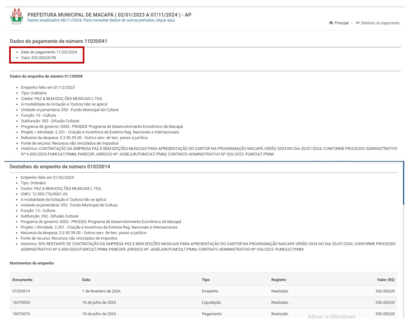 Mas, quando se trata das atrações nacionais o tratamento dado pelo prefeito Furlan é bem diferente.O cachê do cantor Thiaguinho, por exemplo, que também se apresentou no Macapá Verão, foi R$ 700 mil. Detalhe: a metade desse valor foi pago quatro meses antes do show, em março, e a outra metade dois dias antes da apresentação.