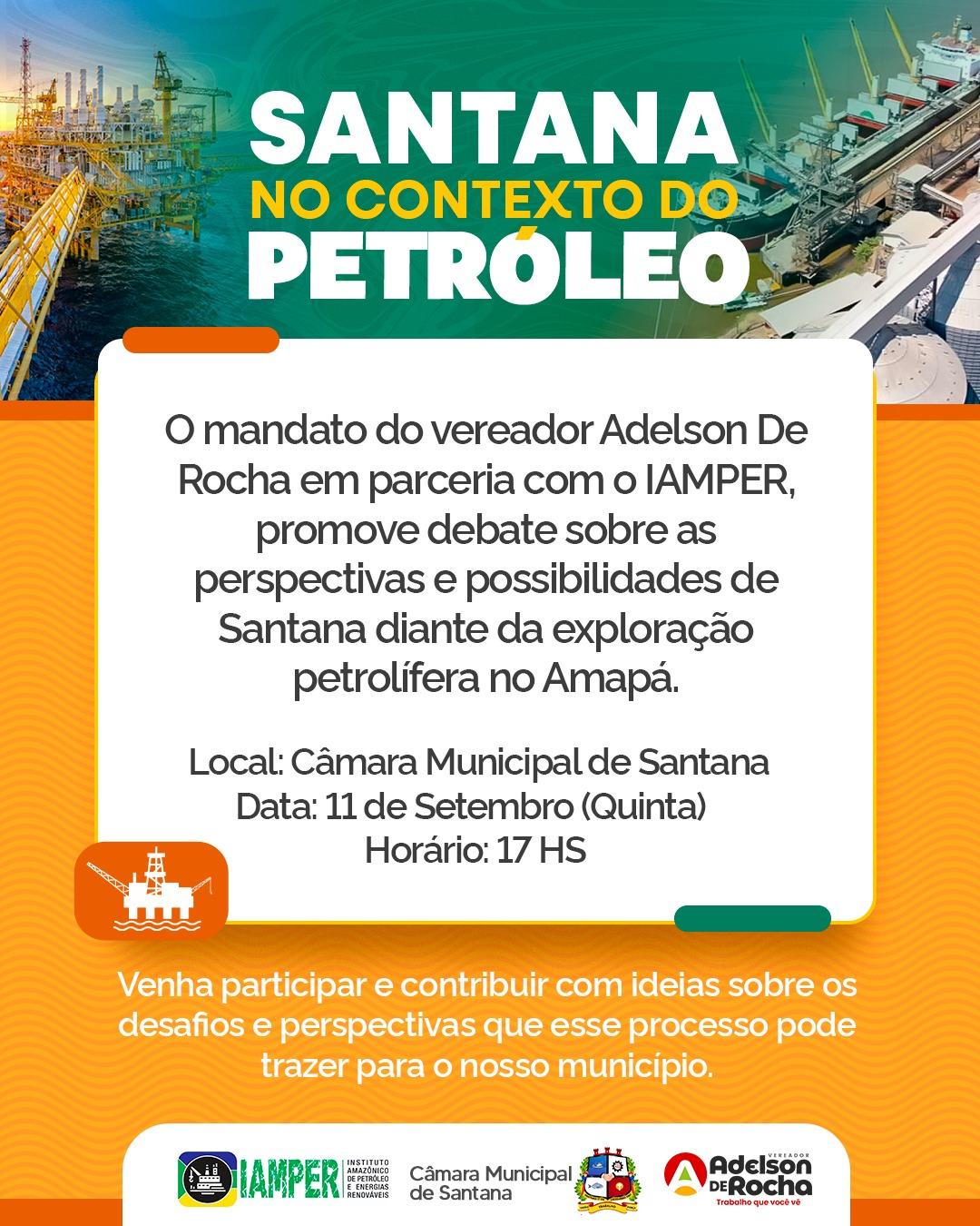 O município de Santana será palco de um debate estratégico sobre o futuro do município diante da exploração de petróleo na Margem Equatorial. O evento “Santana no Debate do Petróleo”, promovido pelo vereador De Rocha em parceria com o Instituto Amazônico de Petróleo e Energias Renováveis (IAMPER), acontece nesta quinta-feira (11), às 17h, na Câmara Municipal de Santana.
