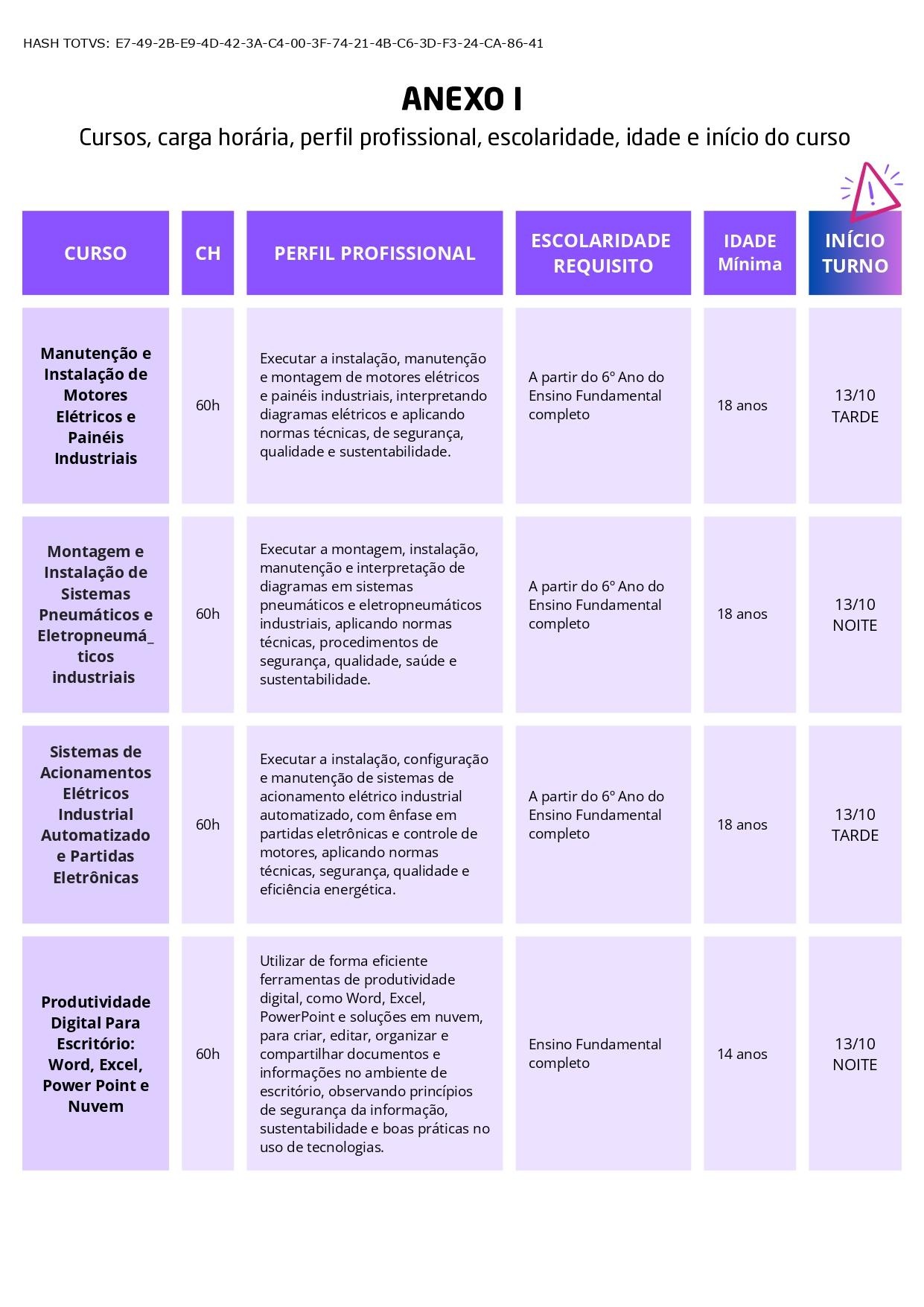 Cada curso possui requisitos de idade mínima e escolaridade. A maioria exige ensino fundamental completo e idades entre 14 e 18 anos, dependendo da formação escolhida. É necessário também apresentar documentação pessoal, comprovante de residência e autodeclaração de baixa renda.