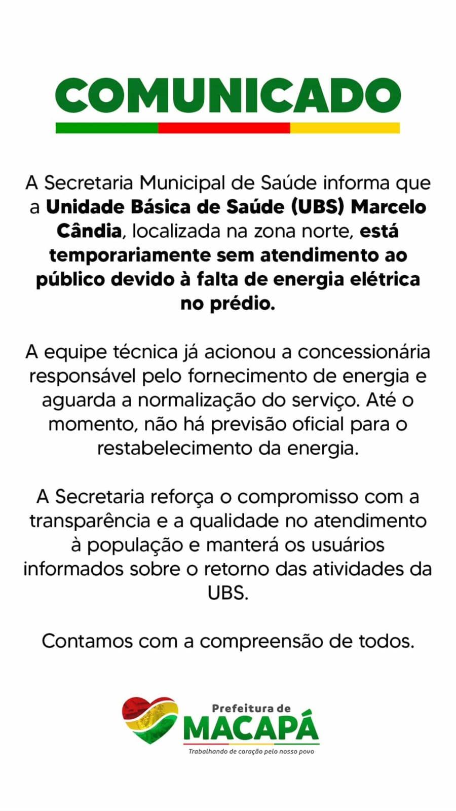 Desde segunda-feira (25), a Unidade Básica de Saúde (UBS) Marcelo Cândia, localizada na zona norte de Macapá, está de portas fechadas, deixando milhares de moradores sem atendimento. Quem buscou a unidade encontrou o portão trancado com cadeado e o interior do prédio no escuro, sem aviso prévio à população.